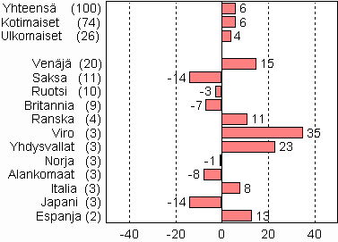 Kotimaisten ja ulkomaisten matkailijoiden yöpymiset Suomen majoitusliikkeissä kääntyivät heinäkuussa kasvuun ja sama suuntaus jatkui myös lokakuussa. Venäläisille tilastoitiin 55 000 yöpymisvuorokautta ja he olivat totuttuun tapaan suurin ulkomaisten matkailijoiden ryhmä lokakuussa. Heidän yöpymistensä määrä oli 15 prosenttia suurempi kuin vuotta aiemmin. Seuraavana olivat ruotsalaiset 29 000 yöpymisellä, vaikka vähennystä viime vuodesta oli 2,5 prosenttia. Kolmantena olivat saksalaiset runsaalla 25 000 yöpymisellä. Heidän yöpymisvuorokaudet vähenivät roimasti ja niitä kirjattiin majoitusliikkeissä 14 prosenttia vähemmän kuin vuotta aiemmin. Sitä vastoin virolaisten ja yhdysvaltalaisten yöpymiset lisääntyivät voimakkaasti. Virolaisten yöpymisiä kirjattiin 35 prosenttia ja yhdysvaltalaisten yöpymisiä 23 prosenttia enemmän kuin lokakuussa 2009.