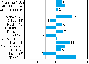 Venäläiset olivat 115 000 yöpymisvuorokaudella ylivoimaisesti suurin ulkomaalaisryhmä joulukuussa 2010. Venäläisten yöpymiset lisääntyivät 15 prosenttia edellisvuoden joulukuusta. Seuraavana olivat britit lähes 100 000 yöpymisellä. Brittien yöpymiset vähenivät 9 prosenttia. Ranskalaiset olivat kolmantena ja he yöpyivät majoitusliikkeissä runsaat 26 000 kertaa, mikä oli 7 prosenttia enemmän kuin vuoden 2009 joulukuussa. Saksalaisten yöpymiset vähenivät 6 prosenttia kun taas ruotsalaisten yöpymiset lisääntyivät 6 prosenttia edellisvuodesta. Matkailu Espanjasta kasvoi 19 prosenttia sekä Norjasta, Alankomaista ja Italiasta 5-13 prosenttia. Sen sijaan matkailu väheni Japanista ja Virosta. Virolaisten yöpymiset vähenivät 9 prosenttia ja japanilaisten 12 prosenttia vuotta aiemmasta.