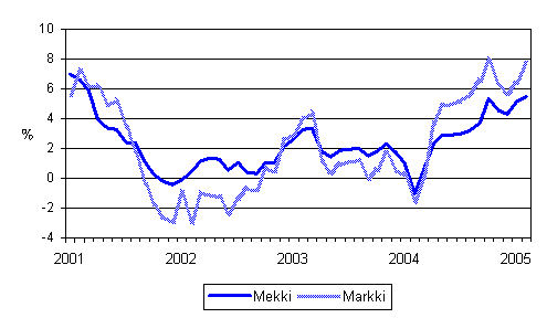 Metsäalan konekustannusindeksin ja maarakennusalan konekustannusindeksin vuosimuutokset 2/2001 - 2/2005