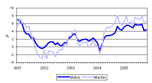 Metsäalan konekustannusindeksin ja maarakennusalan konekustannusindeksin vuosimuutokset 1/2001 - 12/2005