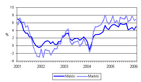 Metsäalan konekustannusindeksin ja maarakennusalan konekustannusindeksin vuosimuutokset 1/2001 - 2/2006