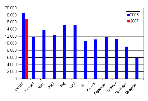 I januari 2007 registrerades 24 774 nya fordon, av vilka 19 381 var bilar. Första registreringarna minskade med 8,0 procent från motsvarande månad året innan. I januari registrerades 16 893 nya personbilar, vilket är 8,4 procent mindre än i fjol. Uppgifterna grundar sig på Fordonsförvaltningscentralens fordonstrafikregister och de har producerats av Statistikcentralen. Uppgifterna omfattar inte fordonen på Åland.