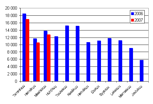 Maaliskuussa 2007 rekisteröitiin 24 317 uutta ajoneuvoa, joista autoja oli 14 839. Ensirekisteröinnit lisääntyivät 10,4 % edellisvuoden vastaavaan kuukauteen verrattuna. Uusia henkilöautoja rekisteröitiin maaliskuussa 12 735, mikä on 7,4 % vähemmän kuin viime vuonna. Tiedot perustuvat Ajoneuvohallintokeskuksen ajoneuvoliikennerekisteriin ja ne on tuottanut Tilastokeskus. Luvuissa ei ole mukana Ahvenanmaan ajoneuvoja.