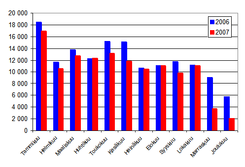Joulukuussa 2007 rekisteröitiin 6 199 uutta ajoneuvoa, joista autoja oli 3 277. Ensirekisteröinnit vähenivät 58,9 % edellisvuoden vastaavaan kuukauteen verrattuna. Uusia henkilöautoja rekisteröitiin joulukuussa 2 093, mikä on 63,8 % vähemmän kuin viime vuonna. Tiedot perustuvat Ajoneuvohallintokeskuksen ajoneuvorekisteriin ja ne on tuottanut Tilastokeskus. Luvuissa ei ole mukana Ahvenanmaan ajoneuvoja.