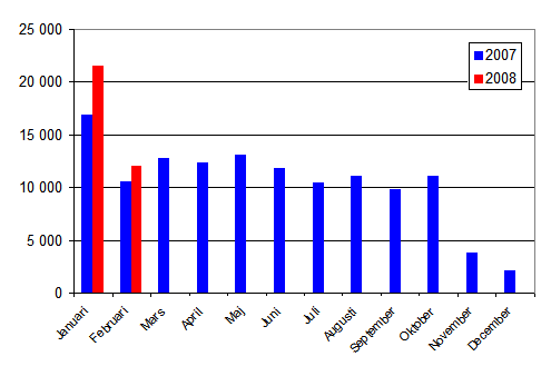 Under januari-februari 2008 registrerades 47 443 nya fordon. Jämfört med året innan var ökningen 13,1 procent. Under början av året var antalet första registreringar av personbilar 33 541, vilket är 22,1 procent mera än i fjol. De mest allmänna personbilsmärkena i första registreringarna under februari var Toyota, Volkswagen, Volvo.