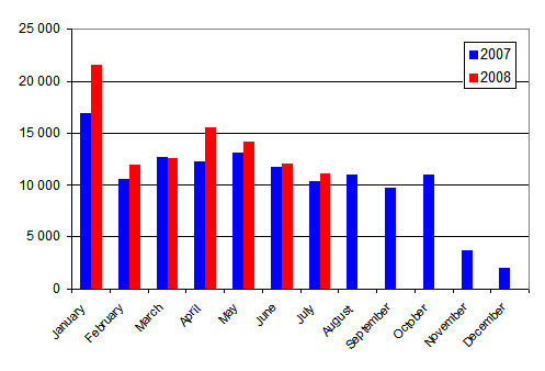 In the January to July period of 2008 a total of 175,467 vehicles were first registered. Compared to the year before, there was a increase of 4.1 per cent. The number of passenger cars first registered in the January to July period was 99,207, which is 12.9 per cent up from the year before. The most common passenger car makes first registered in the January to July period were Toyota, Volkswagen and Volvo.