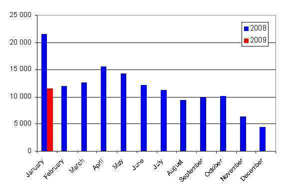 In January 2009 a total of17,372 new motor vehicles were registered, of which 13,386 were automobiles. First registrations decreased by 40.5 per cent from the corresponding month of the previous year. In January the number of new passenger cars registered was 11,540, which was 46.4 per cent down from the year before. The share of new diesel-driven passenger cars was 50.4 per cent. Comparisons of first registrations in January 2008 and 2009 should allow for a revision in vehicle taxation which took effect as of the beginning of 2008, in consequence of first registrations of thousands of vehicles became postponed from late 2007 to 2008.These data are based on the Vehicular and Driver Data Register of the Finnish Vehicle Administration and they have been produced by Statistics Finland. The numbers are exclusive of the vehicles on the Åland Islands.