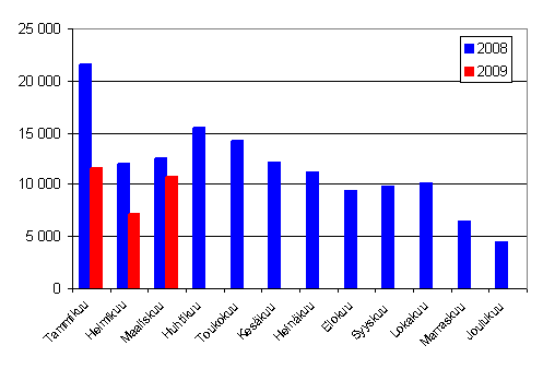Maaliskuussa 2009 ensirekisteröitiin 10 724 uutta henkilöautoa