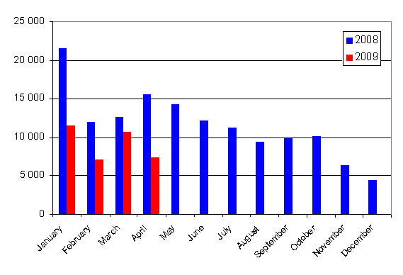 In the January to April period of 2009 a total of 65,995 vehicles were first registered. Compared to the year before, there was a decrease of 34.2 per cent. The number of passenger cars first registered in the January to April period was 36,907, which is 40.1 per cent down from the year before. The most common passenger car makes first registered in the January to April were Toyota, Volkswagen and Ford.
