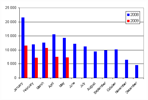 In the January to May period of 2009 a total of 83,507 vehicles were first registered. Compared to the year before, there was a decrease of 35.7 per cent. The number of passenger cars first registered in the January to May period was 44,151, which is 41.8 per cent down from the year before. The most common passenger car makes first registered in the January to May were Toyota, Volkswagen and Ford.