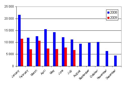 In the January to July period of 2009 a total of 115,624 vehicles were first registered. Compared to the year before, there was a decrease of 34.1 per cent. The number of passenger cars first registered in the January to July period was 58,940, which is 40.6 per cent down from the year before. The most common passenger car makes first registered in the January to July were Toyota, Volkswagen and Ford.
