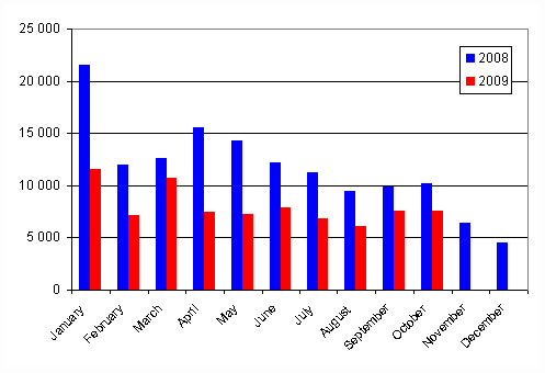 In the January to October period of 2009 a total of 154,455 vehicles were first registered. Compared to the year before, there was a decrease of 32.1 per cent. The number of passenger cars first registered in the January to October period was 80,219, which is 37.7 per cent down from the year before. The most common passenger car makes first registered in the January to October were Toyota, Volkswagen and Ford.