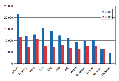 In the January to November period of 2009 a total of 164,333 vehicles were first registered. Compared to the year before, there was a decrease of 31.0 per cent. The number of passenger cars first registered in the January to November period was 86,444, which is 36.1 per cent down from the year before. The most common passenger car makes first registered in the January to November were Toyota, Volkswagen and Ford.