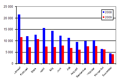 Under januari-december 2009 registrerades 172 466 nya fordon. Jämfört med året innan var minskningen 30,1 procent. Under januari-december 2009 var antalet första registreringar av personbilar 90 574, vilket är 35,2 procent mindre än i fjol. De mest allmänna personbilsmärkena i första registreringarna under januari-december var Toyota, Volkswagen, Ford.