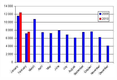 In the January to February period of 2010 a total of 29,220 vehicles were first registered. Compared to the year before, there was an increase of 0.3 per cent. The number of passenger cars first registered in the January to February period was 19,972, which is 6.5 per cent up from the year before. The most common passenger car makes first registered in the January to February were Volkswagen, Toyota and Ford.