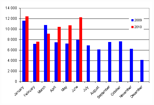 In the January to June period of 2010 a total of 110,788 vehicles were first registered. Compared to the year before, there was an increase of 9.9 per cent. The number of passenger cars first registered in the January to June period was 62,444, which is 19.9 per cent up from the year before. The most common passenger car makes first registered in the January to June were Volkswagen, Toyota and Skoda.