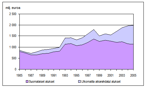 - Suomalaisten ja ulkomailta aikarahdattujen alusten bruttotulot ulkomaan meriliikenteessä 1985-2005, milj. euroa (27.10.2006)