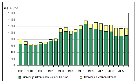 Suomalaisten ja ulkomailta aikarahdattujen alusten ulkomaille maksamat liikennemenot ulkomaan meriliikenteessä 1985-2006, milj. euroa