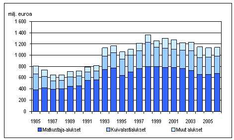 Suomalaisten alusten bruttotulot liikennealueittain ulkomaan meriliikenteessä 1985-2006, milj. euroa