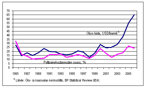 Polttoainekustannusten osuus suomalaisten alusten kaikista ulkomaille maksetuista kustannuksista ulkomaan meriliikenteessä ja raakaöljyn keskihinta 1985-2006