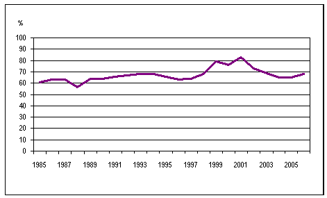 Ulkomailta aikarahdattujen alusten aikarahtikustannusten osuus näiden alusten kaikista liikennemenoista ulkomaille ulkomaan meriliikenteessä 1985-2006