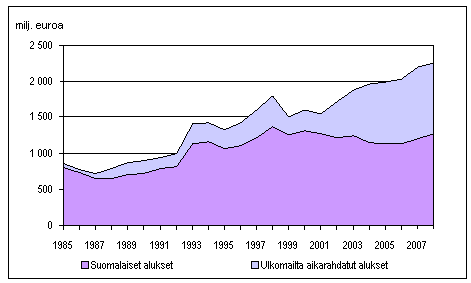 Suomalaisten ja ulkomailta aikarahdattujen alusten bruttotulot ulkomaan meriliikenteessä 1985-2008, milj. euroa