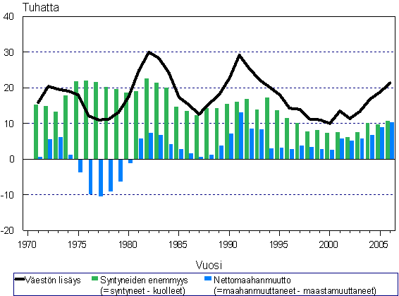 Syntyneiden enemmyys, nettomaahanmuutto ja väestönlisäys 1971 - 2006