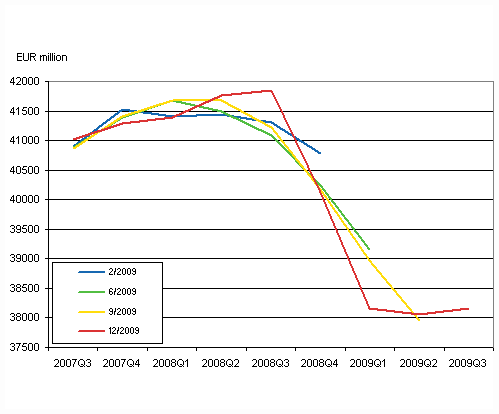 The calculated percentages of change from the previous quarter contain significant revisions, which can also be seen in the seasonally adjusted series of GDP in Figure 2. The revision of the seasonally adjusted time series in the December release was caused by the level shifts that were allowed for the last quarter of 2008 and the first quarter of 2009, which altered the picture of the economic situation. According to the seasonally adjusted time series modelled without the level shifts the economic downturn would have started in the second quarter of 2008 and would still continue strongly. The source data do not support either of these statements. When the level shift is used in seasonal adjustment the steepest decline of the economy coincides with the last quarter of 2008 and the first quarter of 2009, as can also be concluded from the source data. For further information about level shifts in seasonal adjustment, see separate methodological release at: http://tilastokeskus.fi/ajk/tiedotteet/2009/tiedote_019_2009-12-08_en.html