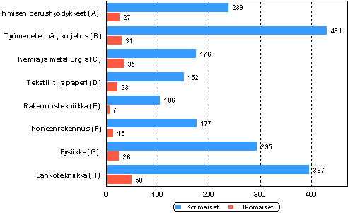 Kansainväliseen patenttiluokituksen (International Patent Classification, IPC) mukaan Suomessa vuonna 2003 jätetyistä kotimaisista hakemuksista eniten, lähes 22 prosenttia, kuului työmenetelmien ja kuljetuksen päälohkolle. Aikaisempina vuosina suurimpana olleen sähkötekniikan alan osuus oli nyt kaksi prosenttiyksikköä pienempi. Ulkomaisissa hakemuksissa sähkötekniikan lohkon osuus oli suurin, 23 prosenttia. Seuraavaksi eniten ulkomaisia hakemuksia jätettiin kemian ja metallurgian alalla, 16 prosenttia.