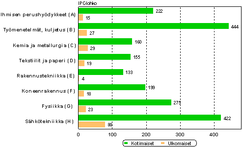 Kansainväliseen patenttiluokituksen (International Patent Classification, IPC) mukaan Suomessa vuonna 2004 jätetyistä kotimaisista hakemuksista eniten, 22 prosenttia, kuului työmenetelmien ja kuljetuksen päälohkolle. Aikaisempina vuosina suurimpana olleen sähkötekniikan alan osuus oli nyt kaksi prosenttiyksikköä pienempi. Ulkomaisissa hakemuksissa sähkötekniikan lohkon osuus oli sitä vastoin suurin, 37 prosenttia. Seuraavaksi eniten ulkomaisia hakemuksia jätettiin kemian ja metallurgian alalla, 13 prosenttia.