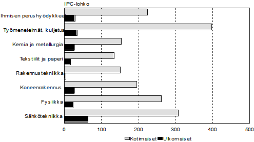 Kansainväliseen patenttiluokituksen (International Patent Classification, IPC) mukaan Suomessa vuonna 2005 jätetyistä kotimaisista hakemuksista eniten, 21 prosenttia, kuului työmenetelmien ja kuljetuksen päälohkolle. Seuraavaksi suurin patenttilohko oli sähkötekniikka, johon kuului 18 prosenttia hakemuksista. Ulkomaisissa hakemuksissa sähkötekniikan lohkon osuus oli suurin, 28 prosenttia. Seuraavaksi eniten ulkomaisia hakemuksia jätettiin työmenetelmien ja kuljetuksen alalla, 15 prosenttia.