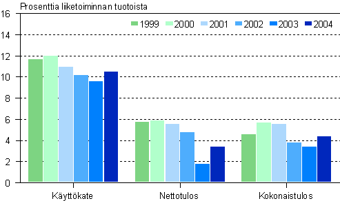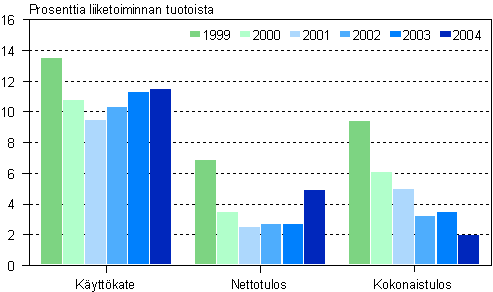 Kun liiketoiminnan tuotoista vähennettiin varsinaisen toiminnan kulut, jäi pk-yrityksille käyttökatetta 10,1 prosenttia, prosenttiyksikön verran vähemmän kuin edellisvuonna. Sen sijaan suurten yritysten käyttökate koheni 4 prosenttiyksikköä vuotta aiemmasta 11,1 prosenttiin liiketoiminnan tuotoista. Kokonaistulosta kummallekin sektorille jäi runsaat 4 prosenttia tuotoista, pk-sektorille 90 ja suurille yrityksille 50 miljoonaa euroa.