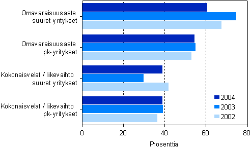 Liiketoiminnan tuotoista pk-yritykset käyttivät 60 prosenttia aine- ja tarvikekäyttöön sekä ulkopuolisiin palveluihin. Henkilöstökulut veivät 21 ja muut kulut 14 prosenttia. Käyttökatetta jäi 46 miljoonaa euroa, mikä oli 5,7 prosenttia tuotoista. Suurilla yrityksillä aine- ja tarvikekäyttö sekä ulkopuoliset palvelut lohkaisivat noin 82 prosenttia tuotoista, henkilöstökuluihin ja liiketoiminnan muihin kuluihin meni vajaat 16 prosenttia, jolloin käyttökatetta jäi 2,1 prosenttia tuotoista.