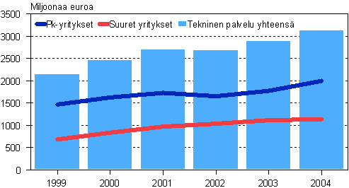 Teknisen palvelun liikevaihto 1999-2004, pk- ja suuret yritykset