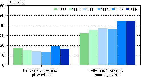 Teknisen palvelun nettovelat 1999-2004, pk- ja suuret yritykset