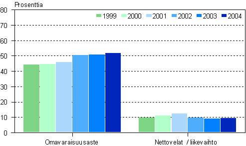 Teknisen palvelun rahoitusasema vahvistui merkittävästi vuotta aiemmasta. Omavaraisuusaste koheni 4,1 prosenttiyksiköllä ja oli 49,9 prosenttia taseesta vuonna 2004. Kokonais- ja nettovelat suhteessa liikevaihtoon pienenivät noin 3 prosenttiyksiköllä ja olivat 42 ja 26,8 prosenttia. Toimialan maksuvalmius säilyi edellisvuosien tapaan hyvänä. Pk-sektorin rahoitusasema oli huomattavasti vahvempi kuin suurten yritysten. Pk-yritysten omavaraisuusaste oli 56,1 prosenttia taseesta ja kokonaisvelat suhteessa liikevaihtoon 35,8 prosenttia. Vastaavat tunnusluvut suurilla yrityksillä olivat omavaraisuusaste 39,7 ja kokonaisvelat 52,9 prosenttia.