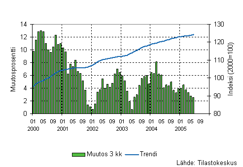 | *) Kolmen kuukauden vuosimuutoksessa verrataan kolmen tilastokuukauden arvoja vuodentakaisten vastinkuukausien arvoihin. | ||||