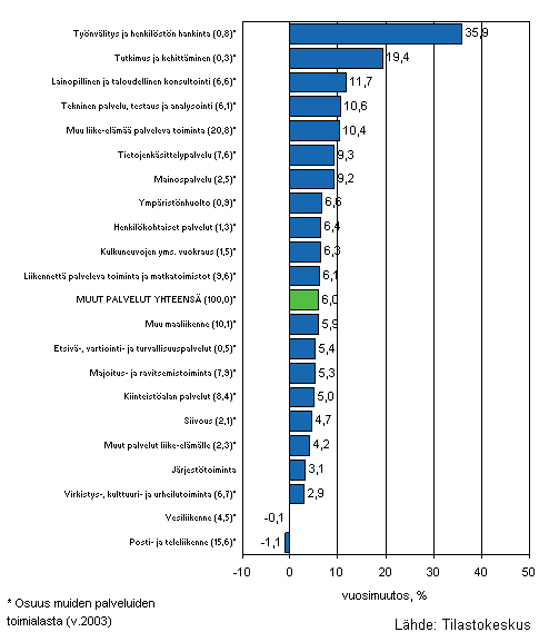 Palvelualojen liikevaihto oli Tilastokeskuksen mukaan vuoden 2005 touko-heinäkuussa 6 prosenttia suurempi kuin vastaavana ajanjaksona vuotta aiemmin. Edellisellä huhtikuuhun päättyneellä kolmen kuukauden ajanjaksolla liikevaihdon lisäys oli 5,4 prosenttia. Palvelualoissa ei ole mukana kaupan toimialoja ja liikevaihto on työpäiväkorjattu poistamalla kalenterista aiheutuvat vaihtelut.