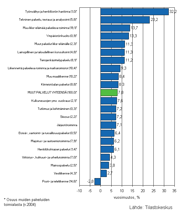 Palvelualojen liikevaihdon kasvu oli vuoden 2005 viimeisellä neljänneksellä nopeinta työnvälityksen ja henkilöstön hankinnan toimialalla, joka kasvoi viime vuoden vastaavasta ajanjaksosta 32,2 prosenttia. Tekninen palvelu, testaus ja analysointi toimialan liikevaihto kasvoi tuoreimmalla neljänneksellä 23,2 prosenttia sekä muu liike-elämää palvelevan toiminnan 13,7 prosenttia. Posti- ja teleliikenne oli ainoa alatoimiala, jossa liikevaihto supistui vuoden 2005 viimeisellä neljänneksellä. Toimialan liikevaihto oli 2,8 prosenttia vuotta aiempaa pienempi.