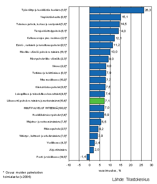 Palvelualojen liikevaihdon kasvu oli helmikuuhun päättyneellä kolmen kuukauden ajanjaksolla voimakkainta työnvälityksen ja henkilöstön hankinnan toimialalla, jonka liikevaihto kasvoi 26,3 prosenttia vuodentakaisesta. Ympäristönhuollon liikevaihto ylsi 15,1 prosentin kasvuun. Heikointa liikevaihdon kehitys oli palvelualoilla posti- ja teleliikenteessä, jossa liikevaihto supistui 1,4 prosenttia sekä järjestötoiminnassa, jossa kasvua kertyi 2,0 prosenttia.