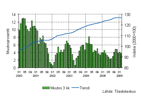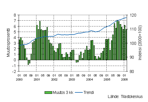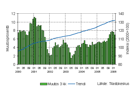 Palvelualojen liikevaihto oli Tilastokeskuksen mukaan joulukuun 2005 ja helmikuun 2006 välisenä aikana 7,0 prosenttia suurempi kuin vastaavana ajanjaksona vuotta aiemmin. Edellisellä marraskuuhun 2005 päättyneellä kolmen kuukauden ajanjaksolla liikevaihdon lisäys oli 7,6 prosenttia. Palvelualoissa ei ole mukana kaupan toimialoja ja liikevaihto on työpäiväkorjattu poistamalla kalenterista aiheutuvat vaihtelut.