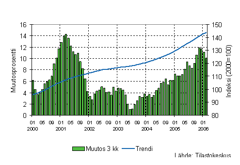| *) Kolmen kuukauden vuosimuutoksessa verrataan kolmen tilastokuukauden arvoja vuodentakaisten vastinkuukausien arvoihin. | ||||