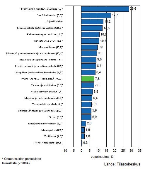 Palvelualojen liikevaihdon kasvu oli vuoden 2006 toisella neljänneksellä voimakkainta työnvälityksen ja henkilöstön hankinnan toimialalla, jossa liikevaihdon lisäys edellisvuoden vastaavaan ajankohtaan oli 28,6 prosenttia. Muita voimakkaasti kasvaneita alatoimialoja olivat mm. ympäristönhuolto ja järjestötoiminta. Heikoimmin palvelualoista kehittyi posti- ja teleliikenne, jonka liikevaihto kohosi 0,3 prosenttia. Myös vesiliikenteen 1,8 prosentin ja mainospalveluiden 1,9 prosentin kasvuluvut jäivät selvästi muita toimialoja matalammiksi.