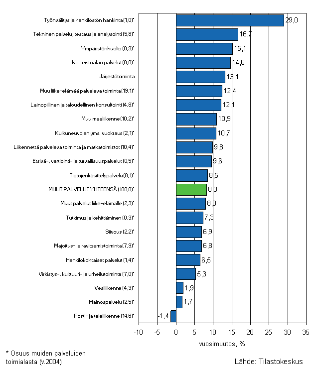 Liikevaihdon kasvu oli valtaosalla palvelualojen alatoimialoista vähintään 5 prosenttia. Vahvimmin alatoimialoista kehittyi työnvälityksen ja henkilöstön hankinnan toimiala, jonka liikevaihto kohosi viime vuoden vastaavasta ajankohdasta 29 prosenttia. Ripeää kasvu oli myös teknisen palvelun, testauksen ja analysoinnin toimialalla, 16,7 prosenttia sekä ympäristönhuollossa 15,1 prosenttia. Liikevaihdon lisäykset jäivät pieniksi mainospalveluissa sekä vesiliikenteessä, joissa molemmissa liikevaihto suureni alle 2 prosenttia. Huonointa kehitys oli posti- ja teleliikenteessä, jonka liikevaihto supistui 1,4 prosenttia.