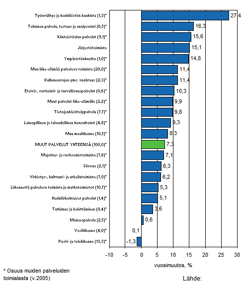 Palvelualoilla kehitys oli selvästi voimakkainta työnvälityksen ja henkilöstön hankinnan toimialalla, jonka liikevaihto vahvistui viimeisten kolmen kuukauden aikana 27,4 prosenttia. Ripeään kasvukehitykseen ylsivät toimialoista myös mm. tekninen palvelu, testaus ja analysointi 16,3 prosentin kasvullaan sekä kiinteistöalan palvelut 15,6 prosentin kasvullaan. Vähäistä liikevaihdon lisäys oli mainospalveluissa, 0,6 prosenttia ja vesiliikenteessä 0,1 prosenttia. Heikointa liikevaihdon kehitys oli posti- ja teleliikenteessä, joka supistui 1,3 prosenttia.