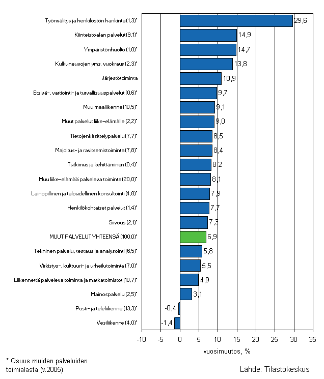 Palvelualoilla kehitys oli selvästi voimakkainta työnvälityksen ja henkilöstön hankinnan toimialalla, jonka liikevaihto vahvistui viimeisten kolmen kuukauden aikana 29,6 prosenttia. Ripeään kasvukehitykseen ylsivät alatoimialoista myös kiinteistöalan palvelut ja ympäristönhuolto, molemmat vajaalla 15 prosentin kasvulla. Heikointa liikevaihdon kehitys oli vesiliikenteessä, joka supistui 1,4 prosenttia. Myös posti- ja teleliikenteen liikevaihto supistui hivenen vuotta aiemmasta.