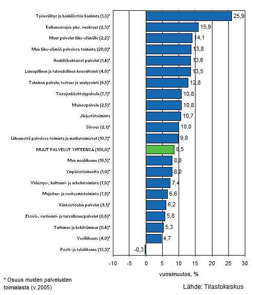 Palvelualojen liikevaihdon kasvu oli vuoden 2007 tammi-syyskuussa voimakkainta työnvälityksen ja henkilöstön hankinnan toimialalla, eikä loka-joulukuu poikennut tästä, toimialan liikevaihto kasvoi 25,9 prosenttia vuodentakaisesta. Vuoden 2007 neljännellä neljänneksellä kasvu oli voimakasta myös kulkuneuvojen yms. vuokrauksessa, jossa yllettiin 15,9 prosentin kasvuun ja muissa liike-elämän palveluissa, joissa kasvua kertyi 14,1 prosenttia vuoden 2006 vastaavaan ajanjaksoon verrattuna. Palvelualoilla heikointa liikevaihdon kehitys oli posti- ja teleliikenteessä, jossa liikevaihto supistui hieman viime vuoden vastinneljänneksestä.