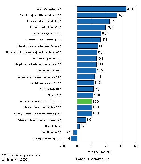 Muiden yhteiskunnallisten ja henkilökohtaisten palveluiden liikevaihto kasvoi vuoden ensimmäisellä neljänneksellä 11,5 prosenttia. Alatoimialoista kasvua kertyi eniten ympäristönhuollossa, jossa liikevaihto oli huikeat 33,4 prosenttia suurempi kuin viime vuoden vastaavana ajanjaksona. Henkilökohtaisten palveluiden liikevaihdon kasvuvauhti rauhoittui ja kasvua kertyi 11,3 prosenttia vuodentakaisesta vastinneljänneksestä. Virkistys-, kulttuuri- ja urheilutoiminnan liikevaihto kasvoi 5,9 prosenttia ja järjestötoiminnan vaatimattomat 1,7 prosenttia.