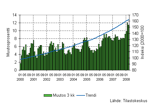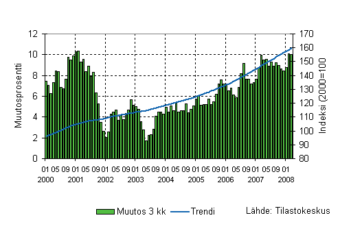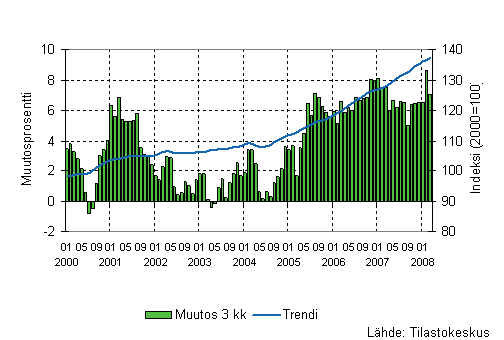 Palvelualojen liikevaihto oli Tilastokeskuksen mukaan vuoden 2008 ensimmäisellä neljänneksellä 10,0 prosenttia suurempi kuin vastaavalla neljänneksellä vuotta aiemmin. Liikevaihdon kasvu kiihtyi vuoden 2007 viimeisestä neljänneksestä, jolloin liikevaihdon lisäys oli 8,5 prosenttia. Palvelualoissa ei ole mukana kaupan toimialoja ja tiedot on työpäiväkorjattu poistamalla kalenterista aiheutuvat vaihtelut.