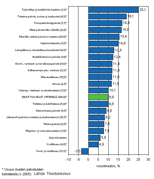 Muiden yhteiskunnallisten ja henkilökohtaisten palveluiden liikevaihto on kasvanut vuodesta 2000 lähtien. Toimialan liikevaihdon kehitys on viime vuosina ollut melko voimakasta ja muutosvauhti on pienimmilläänkin ollut 4 prosentin tuntumassa. Vuonna 2005 toimialan kasvu oli hieman edellisvuotta hitaampaa mutta kesällä 2006 rikottiin jo 9 prosentin raja.